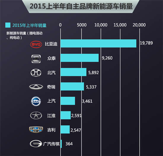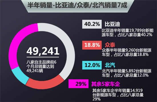 此次统计的八家自主品牌包括比亚迪、众泰、北汽、奇瑞、上汽、江淮、吉利以及广汽传祺,其中比亚迪、众泰、北汽是上半年新能源车销量排名前三的企业,总计达到34,941辆,占上述八家自主品牌新能源车总销量的71.0%。
